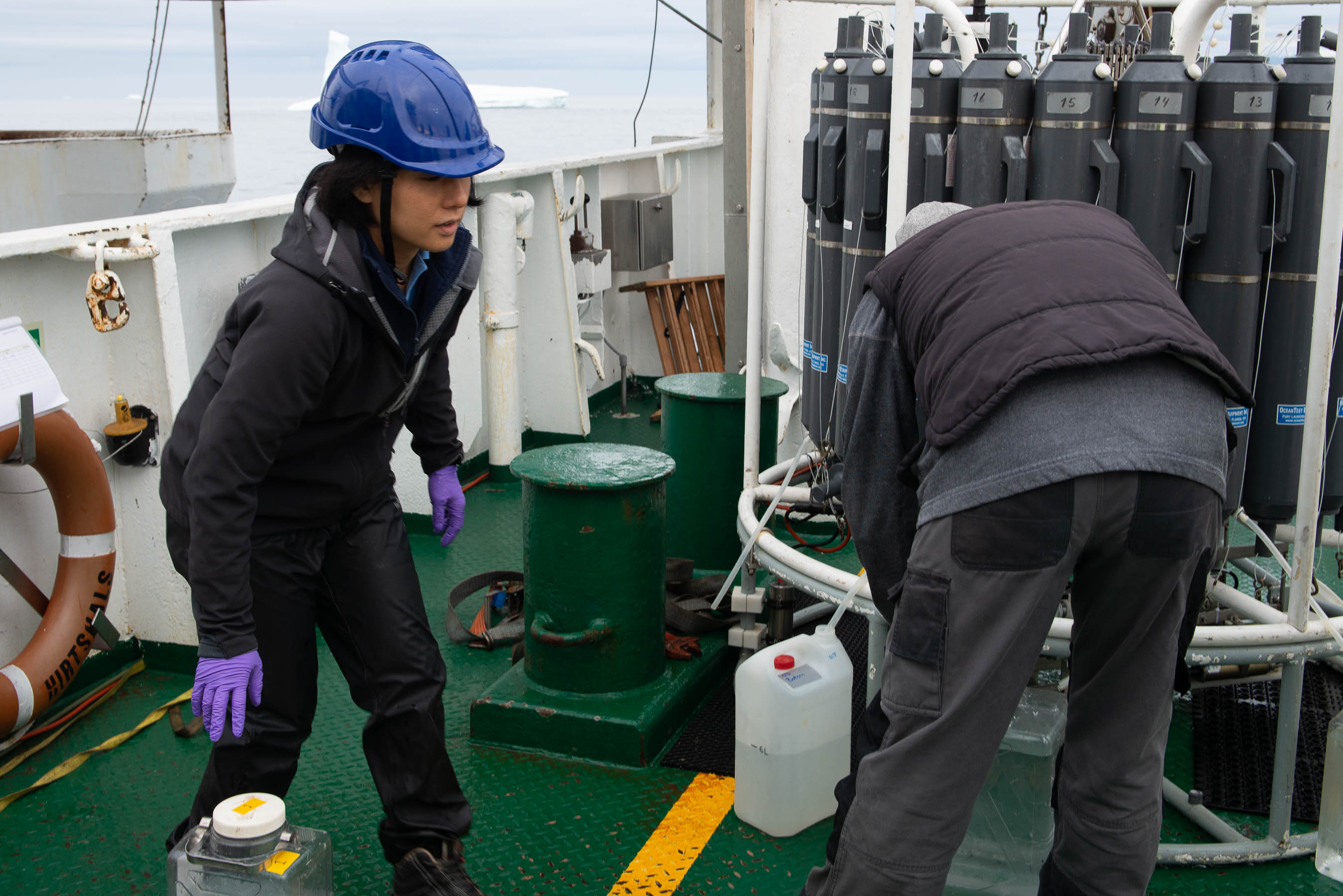 Photo: ECOTIP West Greenland cruise 2021, 2 staff carrying out sampling.